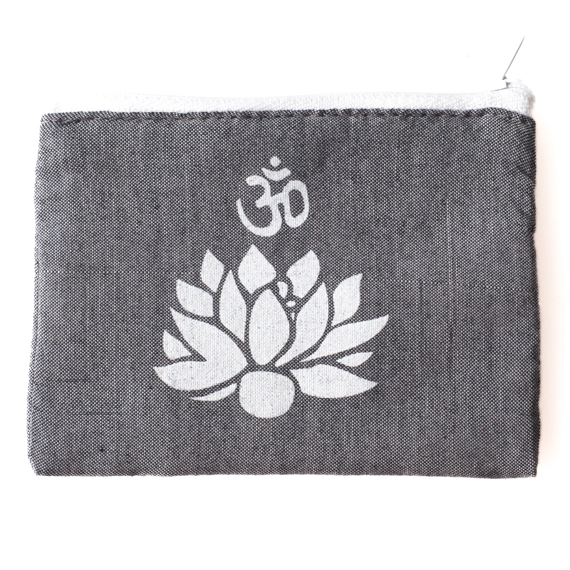 Kvalitní balijská peněženka je ušita z dvouvrstvé, na dotek velmi příjemné měkké bavlny v elegantní, jemné šedé barvě a uzavíratelná na klasický zip. Vnitřní prostor není členěn, lze do ní uložit ledacos – od mincí a bankovek, přes doklady či vizitky, až po osobní talismany a jiné drobnosti denní potřeby. Peněženka je zdobena motivem lotosu a posvátným symbolem Óm.