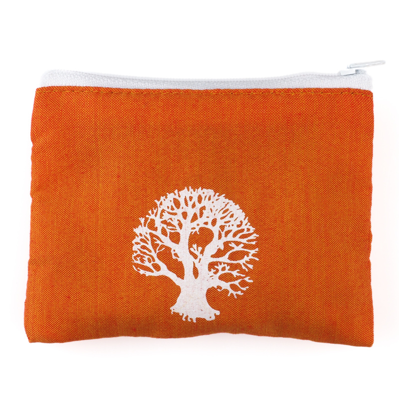 Kvalitní balijská peněženka je ušita z dvouvrstvé, na dotek velmi příjemné měkké bavlny v energické, povzbuzující oranžové barvě a uzavíratelná na klasický zip. Vnitřní prostor není členěn, lze do ní uložit ledacos – od mincí a bankovek, přes doklady či vizitky, až po osobní talismany a jiné drobnosti denní potřeby. Peněženka je zdobena půvabným motivem Stromu života.