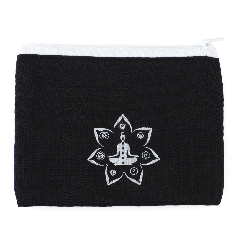 Kvalitní balijská peněženka je ušita z dvouvrstvé, na dotek velmi příjemné měkké bavlny v tajuplné černé barvě a uzavíratelná na klasický zip. Vnitřní prostor není členěn, lze do ní uložit ledacos – od mincí a bankovek, přes doklady či vizitky, až po osobní talismany a jiné drobnosti denní potřeby. Peněženka je zdobena symbolem Jógy.