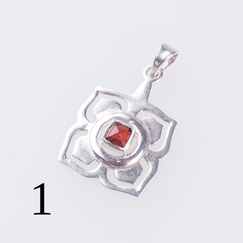 Nádherný stříbrný šperk, symbolizující základní čakru Muladhara, je vyroben ze stříbra 925 a ozdoben pyramidkou z granátu.