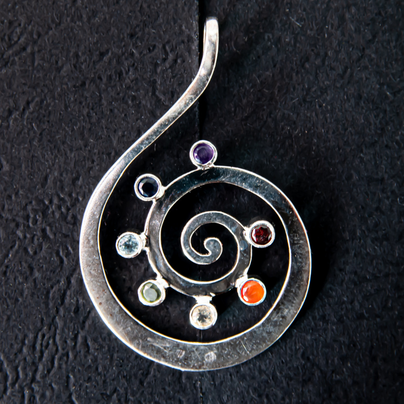 Stříbrný přívěsek Kundalini je vyroben ze stříbra 925 a polodrahokamů: granát, karneol, citrín, peridot, modrý topaz, iolit a ametyst. Kundalini je doslova had nebo hadí síla, sídlící u samotných kořenů základu člověka - obtočená kolem základní čakry Muladhary. Je-li tato síla probuzena, pak stoupá vzhůru, prochází energetickými centry (čakrami) a v momentě kdy dosáhne korunní čakry, dojde ke svému cíli - osvícení.
