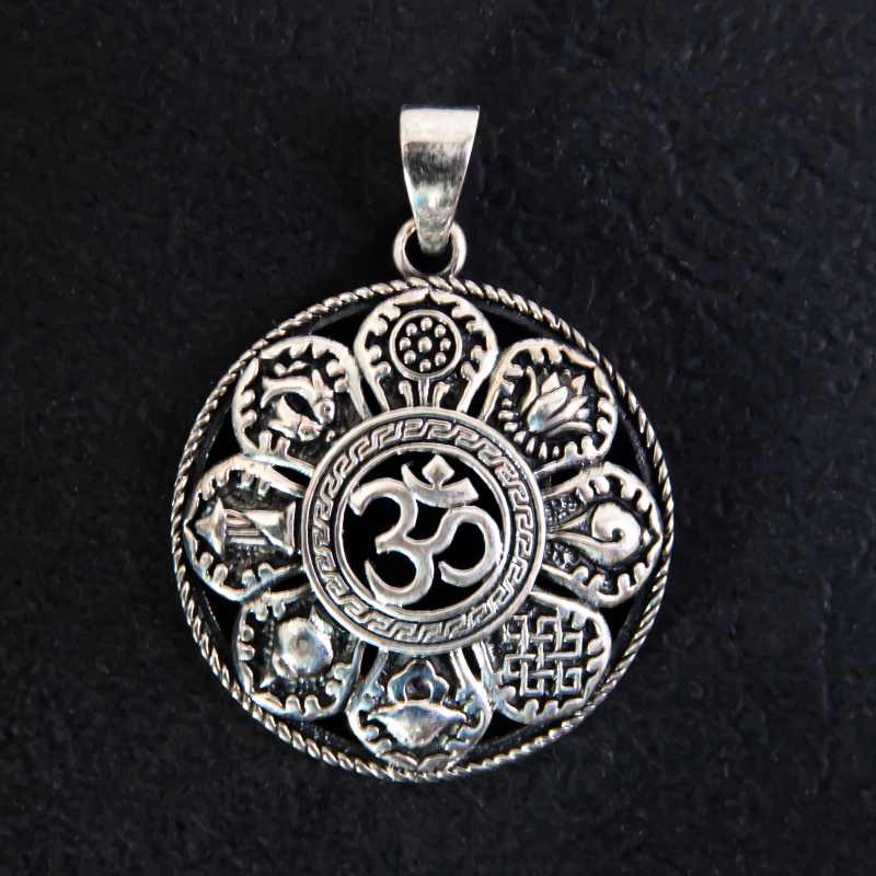 Elegantní stříbrný přívěsek se slabikou Óm, obklopenou osmi šťastnými symboly.