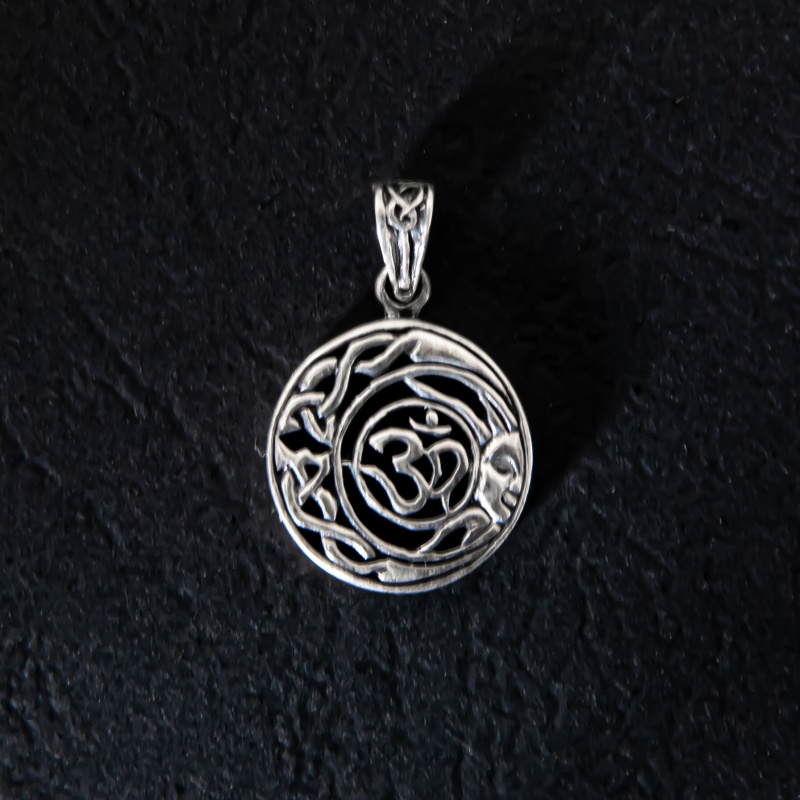 Elegantní stříbrný přívěsek se slabikou Óm v objetí slunce a měsíce.