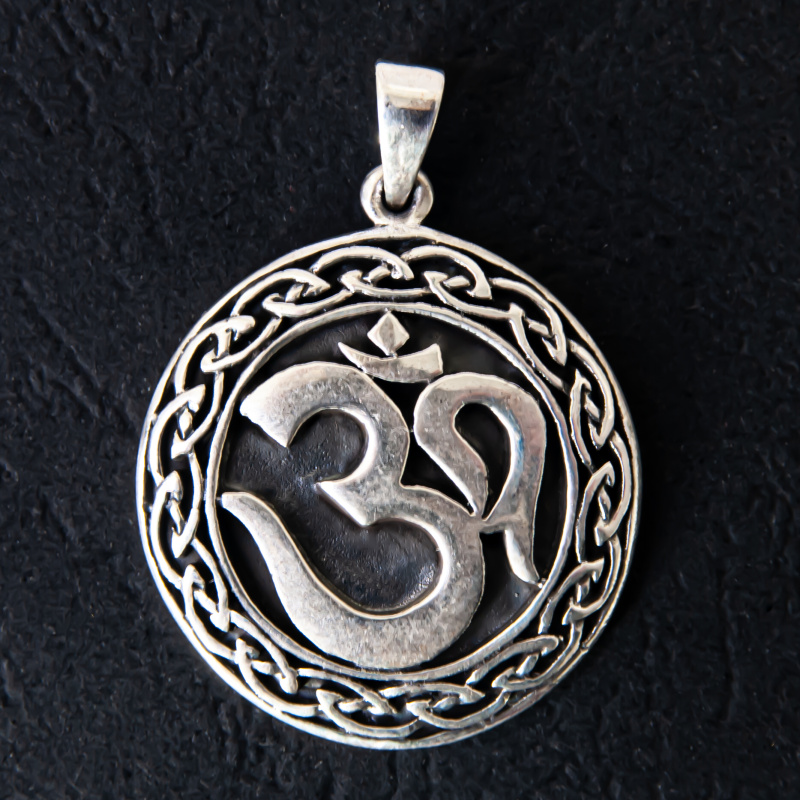 Stříbrný přívěsek ve tvaru medailonu zdobeného proplétaným kruhem a slabikou Óm.