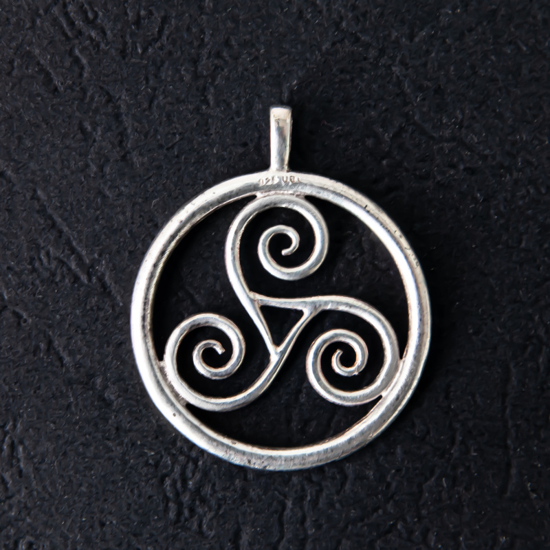 Stříbrný přívěsek Věčná trojice zobrazující tři spirály symbolizující nikdy nekončící oběh vody, vzduchu a země.