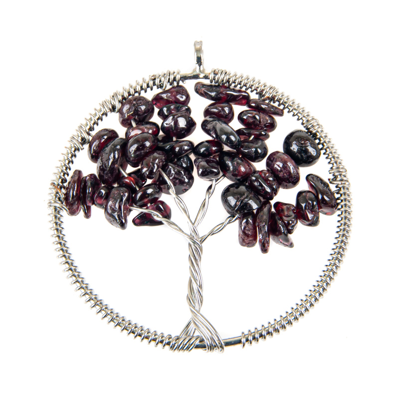 Jednoduchý drátovaný přívěsek ve tvaru stromu života z granátu.