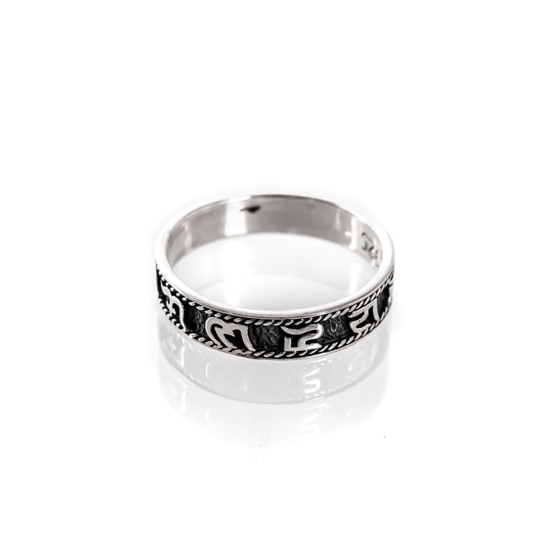 Stříbrný prsten, zdobený po obvodu mantrou, vystupující z tmavé plochy prstenu.
