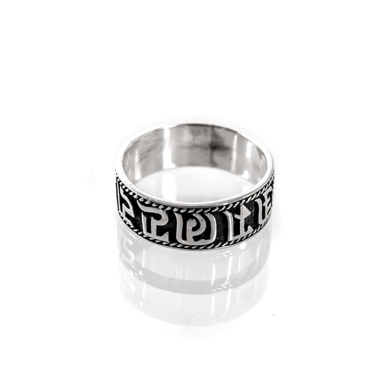 Stříbrný prsten, zdobený mantrou Óm mani padmé húm vystupující z tmavé plochy prstenu.