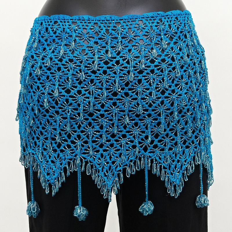 Elegantní háčkovaný šátek na orientální tanec Ahura, bohatě zdobený korálky, barva tyrkysová