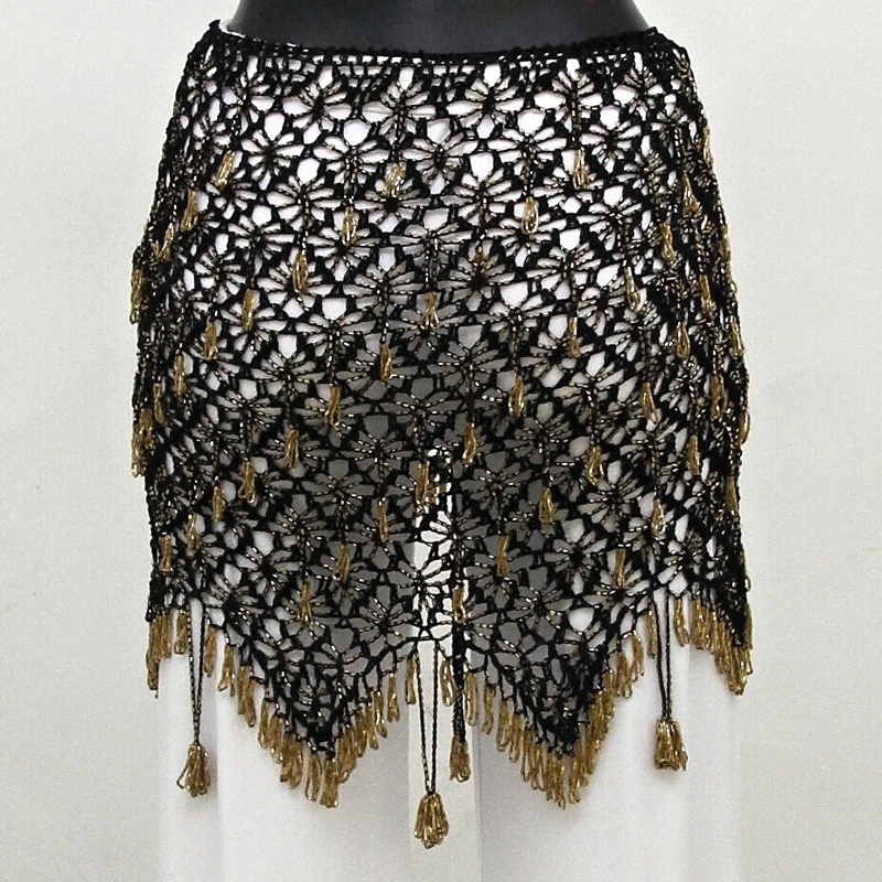 Elegantní háčkovaný šátek na orientální tanec Ahura, bohatě zdobený korálky, barva zlatá