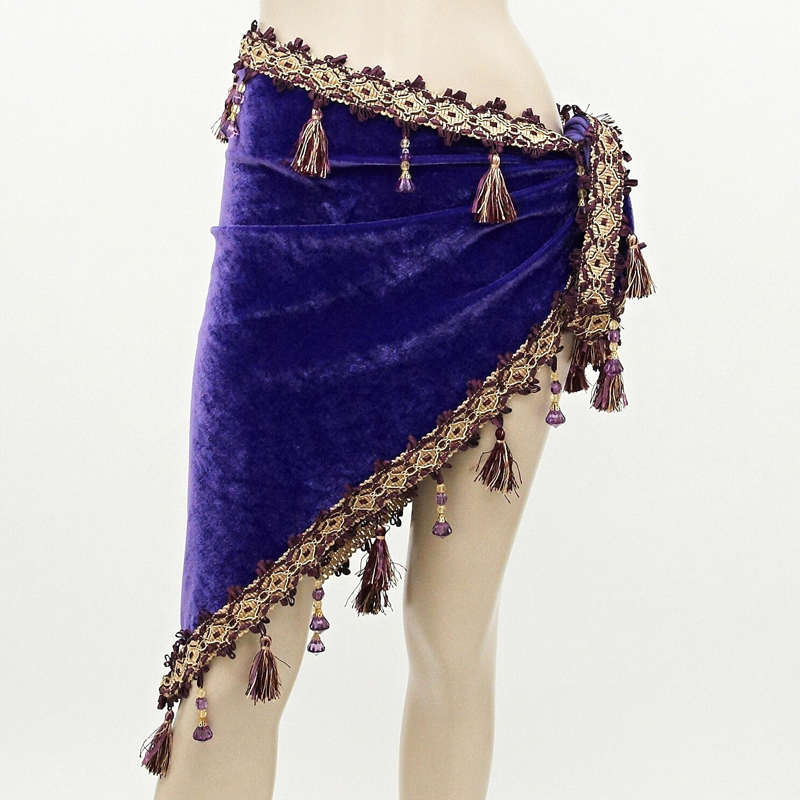 Sametově jemný šátek na orientální tanec Cabar, ve tvaru trojúhelníku, zdobený tradičními korálky a střapci, 01