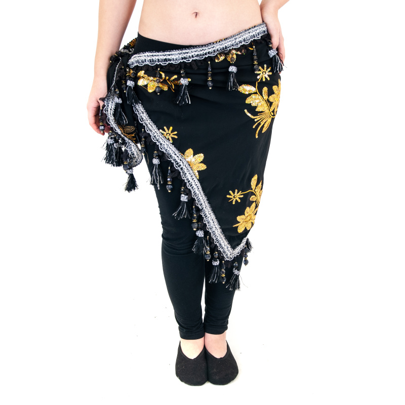 Okouzlující šátek na orientální tanec Layla, zdobený květinovými motivy z flitrů, korálky a střapci, černá