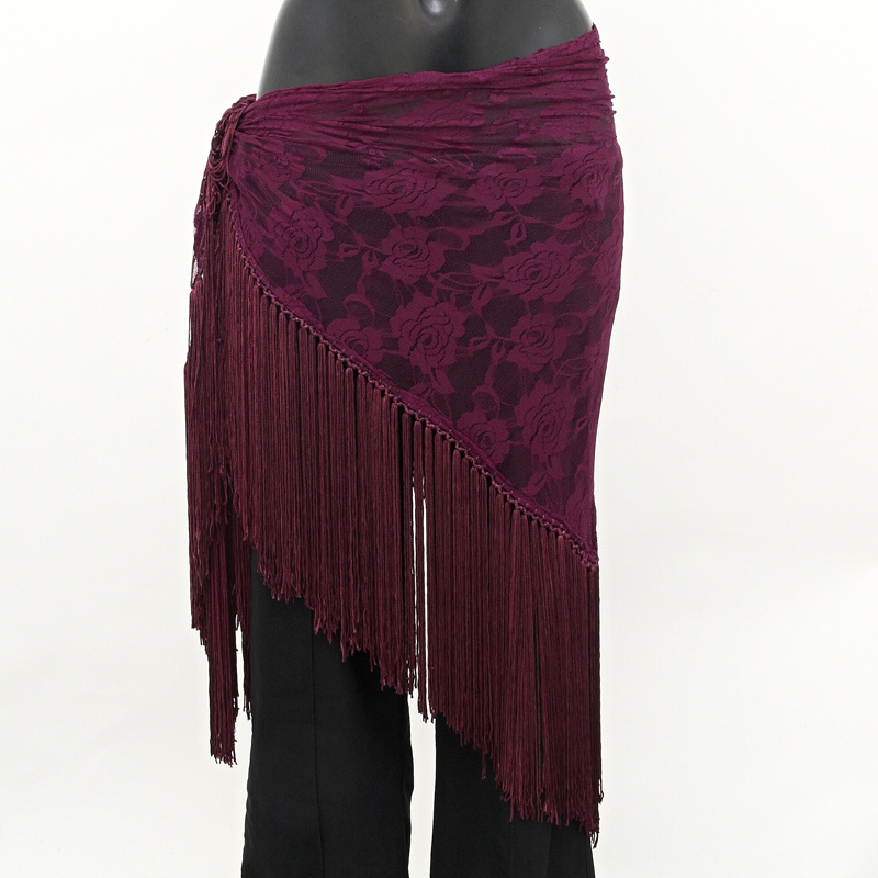 Krásný krajkový šátek na orientální tanec Nailah, zdobený dlouhými třásněmi, barva fialová