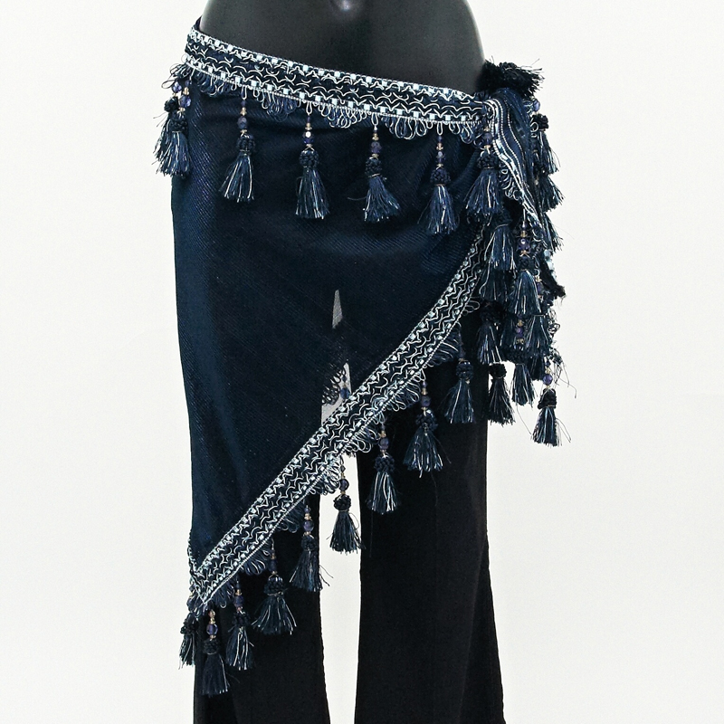 Krásně třpytivý šátek na orientální tanec Nena, ve tvaru trojúhelníku, zdobený tradičními korálky a střapci, 03