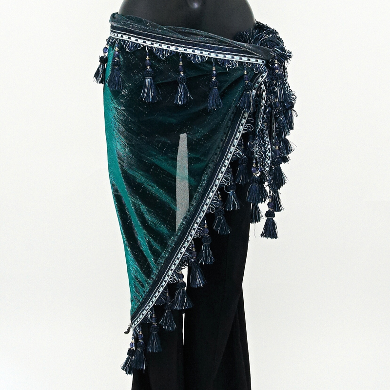 Krásně třpytivý šátek na orientální tanec Nena, ve tvaru trojúhelníku, zdobený tradičními korálky a střapci, 05