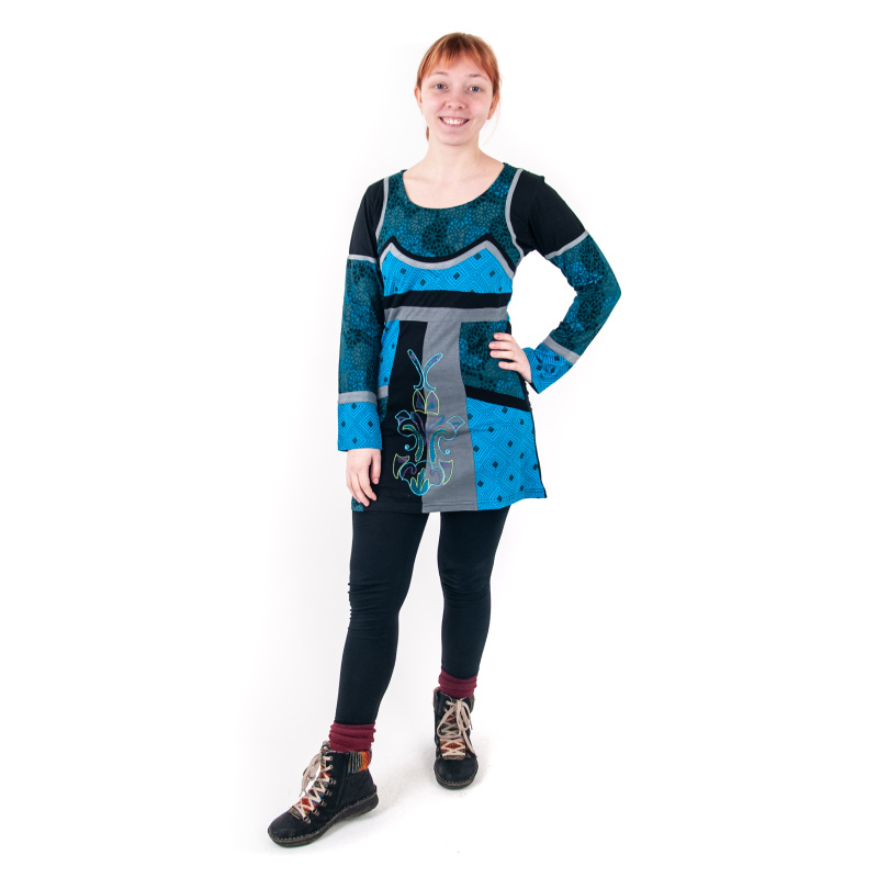 Vzorované nepálské šaty Joy 16 v tyrkysovočerném provedení, velikost M