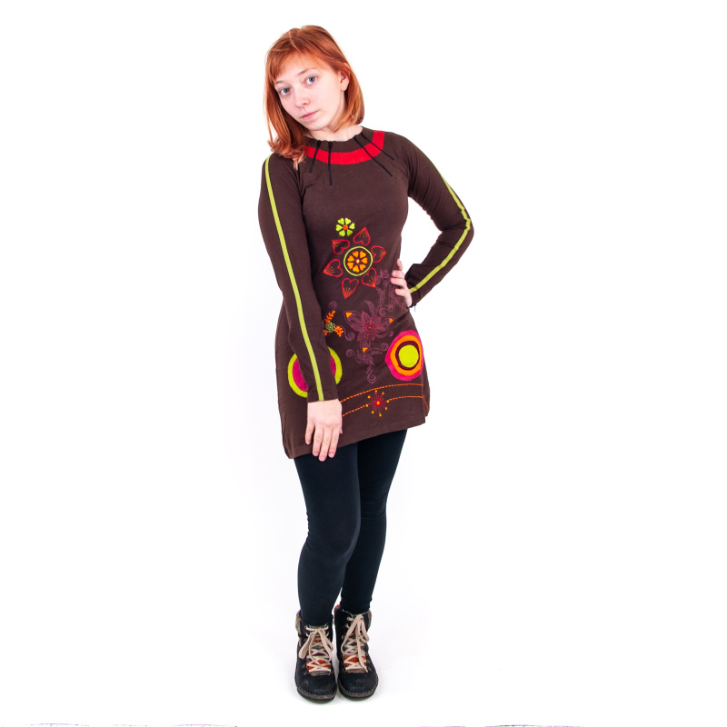 Nepálské šaty s květinovými motivy a dlouhým rukávem Joy 17 v hnědé barvě, velikost XL