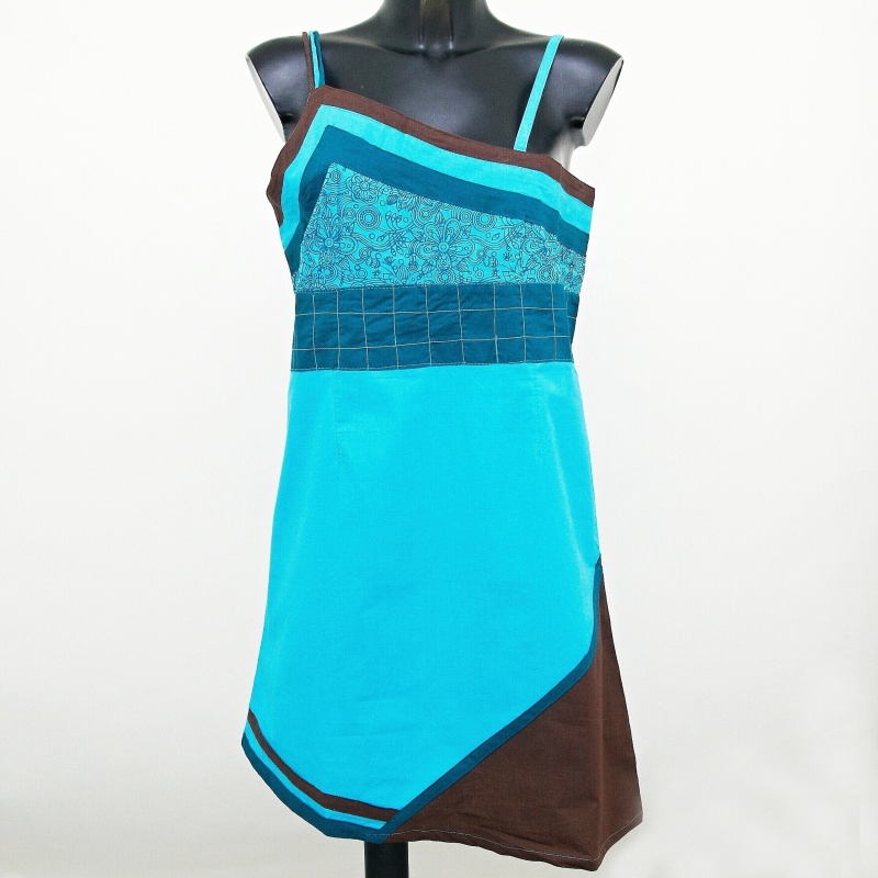 Zajímavě asymetricky střižené a zdobené krátké šaty Sanjana, tenká ramínka, velikost XL, tyrkysová hnědá