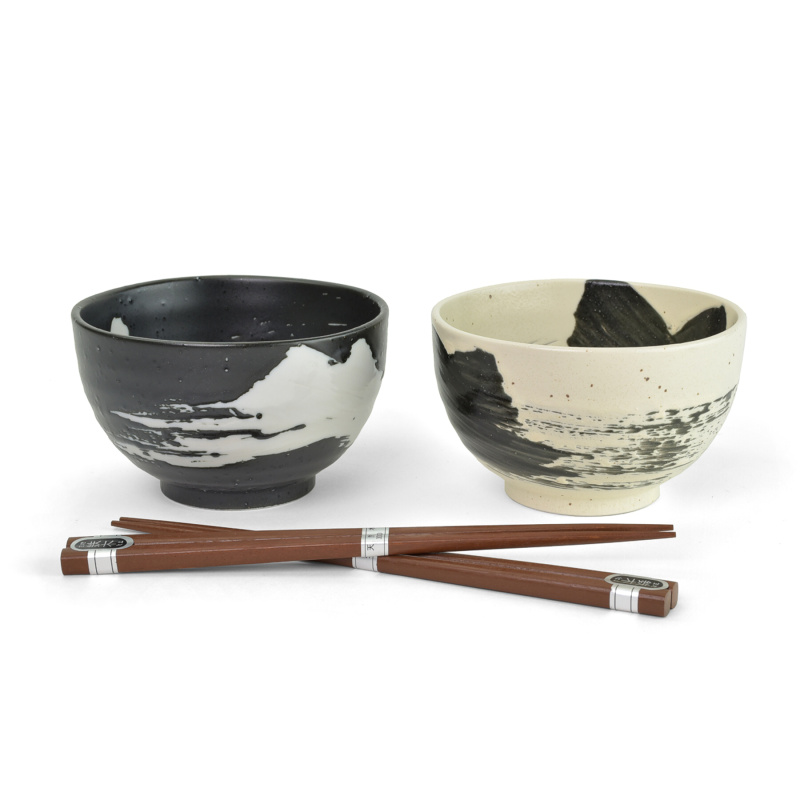 Originální japonský set dvou mističek je barevně laděn do harmonického spojení protikladů světlé a tmavé barvy. Set je vyroben z kvalitních a zdravotně nezávadných materiálů a balen v originální krabičce. Skvěle se tak hodí jako dárek. Součástí setu jsou také dva páry dřevěných jídelních hůlek.
