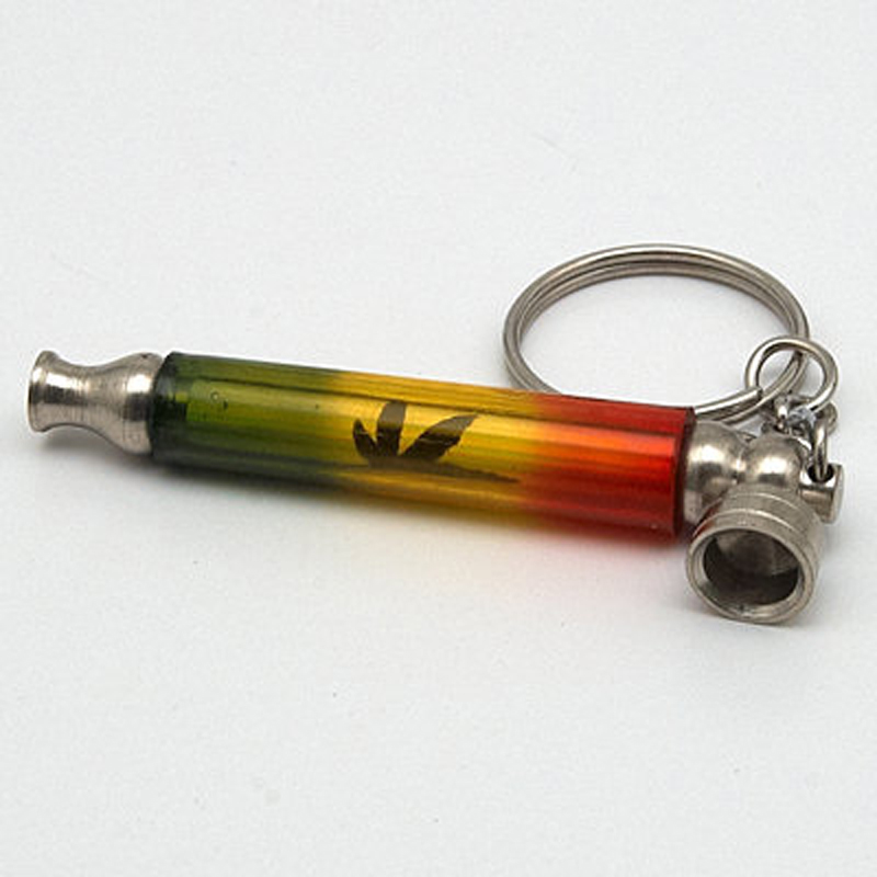 Kovová šlukovka menších rozměrů na řetízku s kroužkem pro připnutí na klíče. Dýmka je ozdobena tradiční rasta barevnou trojkombinací a malým zeleným lístkem.