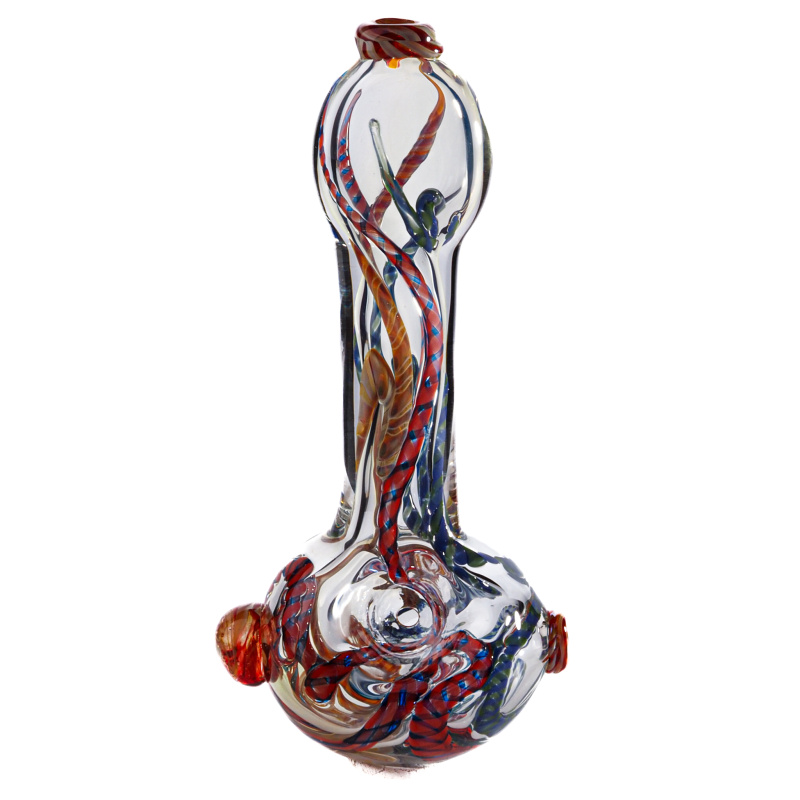 Obří tlustostěnná šlukovka z odolného borosilikátového skla pyrex s bočním turbem. Dýmka je celá zdobená barevnými hady.