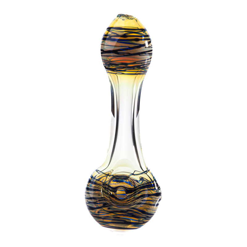 Perfektní menší nažloutlá šlukovka z odolného borosilikátového skla pyrex s bočním turbem. Dýmka je na kotlíku a náustku zdobená modrými proužky.