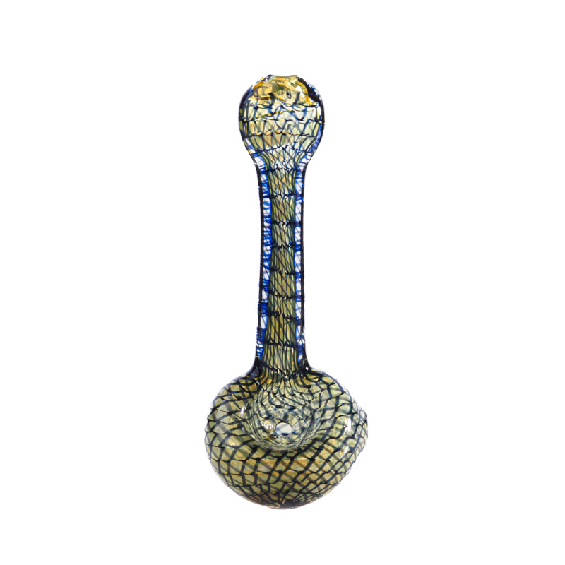 Perfektní menší šlukovka z odolného borosilikátového skla pyrex se zůženým náustkem a bočním turbem. Dýmka je celá zdobená modrými proužky.