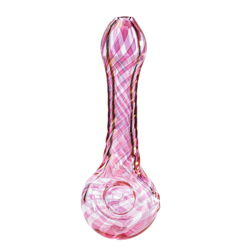 Menší šlukovka z odolného borosilikátového skla pyrex s bočním turbem. Dýmka je zdobená růžovou spirálou a zlatým povlakem z 24 karátového zlata.