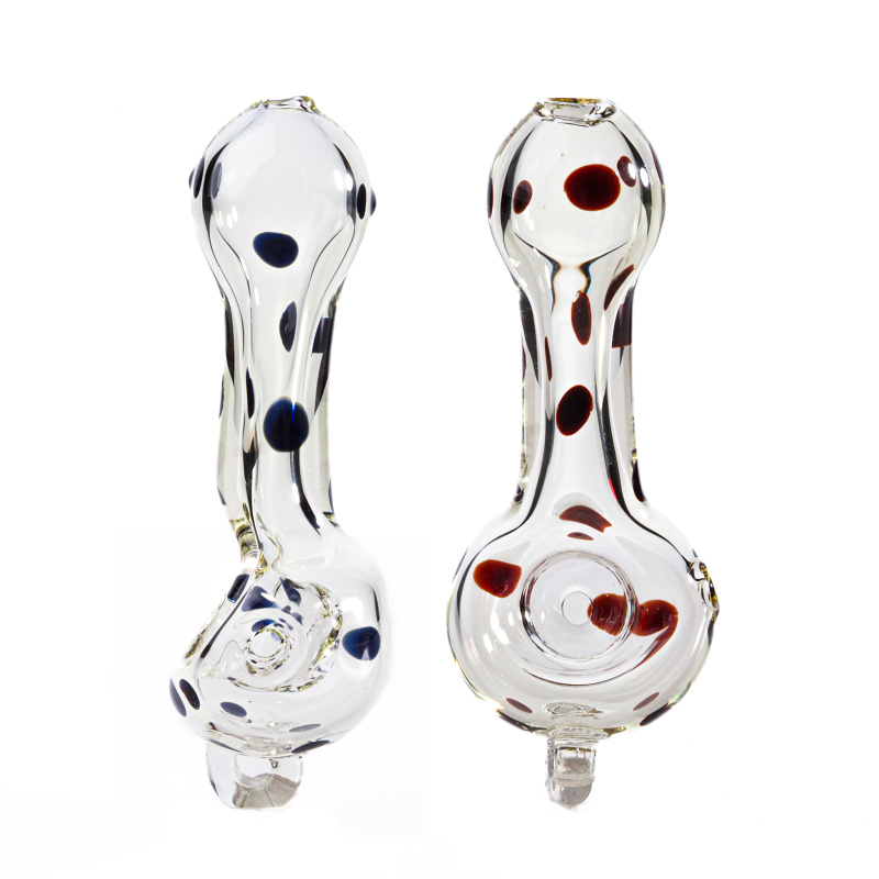 Malá šlukovka z odolného borosilikátového skla pyrex s bočním turbem a malým poutkem pro zavěšení na kotlíku. Dýmka je celá zdobená malými barevnými tečkami.