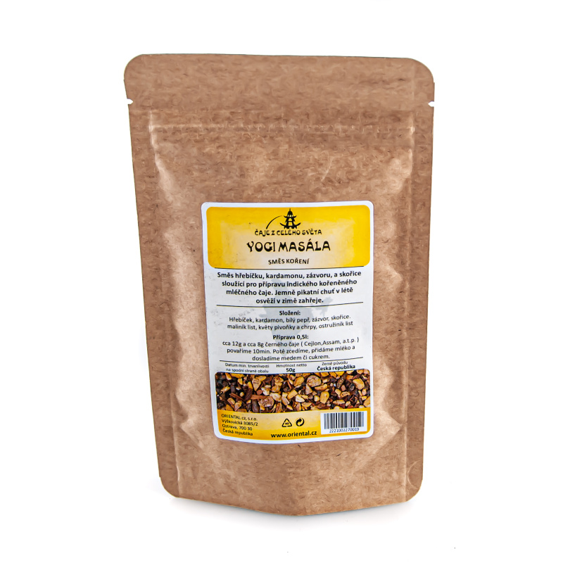 Yogi Masala - směs koření pro přípravu čaje zvaného Másala - nebo také i Yogi čaj. Osvěžující pikantní čajové pochutnání. Směs hřebíčku, kardamonu, bílého pepře, zázvoru, a skořice sloužící pro přípravu indického kořeněného mléčného čaje. Jemně pikantní chuť, v létě osvěží, v zimě zahřeje.