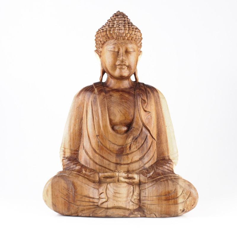 Dřevěné sochy Buddhy zaujímají v buddhistickém umění zvláštní místo. Vyřezané ze štědrosti přírody vyzařují teplo a klid. Forma soch, držení těla a gesta rukou, znamé jako mudry, mají specifické významy. Pozice vsedě se složenýma nohama (padmasana) je základní meditační polohou a vyjadřuje vnitřní mír a osvícení. Symbolickou váhu má i samotný materiál - dřevo. V mnoha kulturách představuje růst, transformaci a spojení s přírodou. Přirozené nedokonalosti dodávají každé soše charakter a osobitost.
