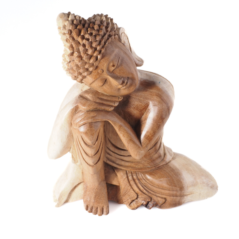 Dřevěné sochy Buddhy zaujímají v buddhistickém umění zvláštní místo. Vyřezané ze štědrosti přírody vyzařují teplo a klid. Forma soch, držení těla a gesta rukou, znamé jako mudry, mají specifické významy. Pozice vsedě s hlavou opřenou o koleno představuje harmonii a pohodu získané meditací. Buddha zde nepřemýšlí o ničem naléhavém, ale prostě existuje. Zdůrazňuje potřebu rovnováhy myšlení a odpočinku. Symbolickou váhu má i samotný materiál - dřevo. V mnoha kulturách představuje růst, transformaci a spojení s přírodou. Přirozené nedokonalosti dodávají každé soše charakter a osobitost.