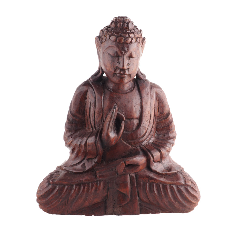 Dřevěné sochy Buddhy zaujímají v buddhistickém umění zvláštní místo. Vyřezané ze štědrosti přírody vyzařují teplo a klid. Forma soch, držení těla a gesta rukou, znamé jako mudry, mají specifické významy. Spojení palce a ukazováčku do kruhu, přičemž ostatní tři prsty zůstávají natažené, se nazývá Vitarka mudra. Je gestem intelektuálního diskursu, vzdělávání a předávání moudrosti. Kruh zde představuje nepřetržitý tok energie symbolizující nekonečný cyklus výuky a učení. Dlaň směřuje ven, což znamená otevřenost a akt komunikace. Symbolickou váhu má i samotný materiál - dřevo. V mnoha kulturách představuje růst, transformaci a spojení s přírodou. Přirozené nedokonalosti dodávají každé soše charakter a osobitost.