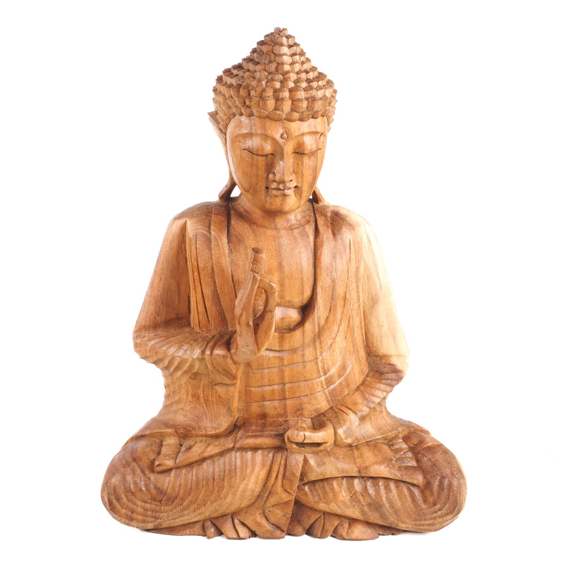Dřevěné sochy Buddhy zaujímají v buddhistickém umění zvláštní místo. Vyřezané ze štědrosti přírody vyzařují teplo a klid. Forma soch, držení těla a gesta rukou, znamé jako mudry, mají specifické významy. Spojení palce a ukazováčku do kruhu, přičemž ostatní tři prsty zůstávají natažené, se nazývá Vitarka mudra. Je gestem intelektuálního diskursu, vzdělávání a předávání moudrosti. Kruh zde představuje nepřetržitý tok energie symbolizující nekonečný cyklus výuky a učení. Dlaň směřuje ven, což znamená otevřenost a akt komunikace. Symbolickou váhu má i samotný materiál - dřevo. V mnoha kulturách představuje růst, transformaci a spojení s přírodou. Přirozené nedokonalosti dodávají každé soše charakter a osobitost.