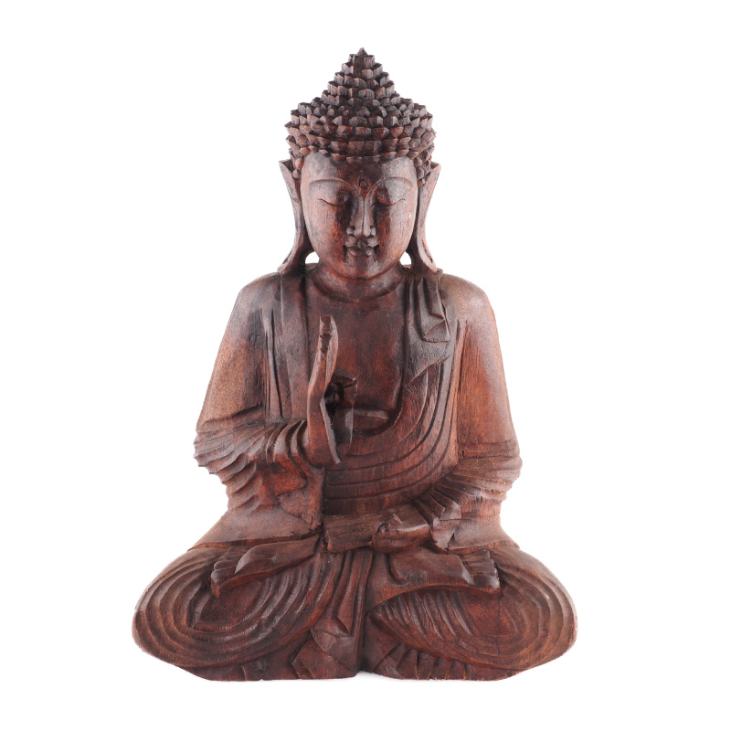 Dřevěné sochy Buddhy zaujímají v buddhistickém umění zvláštní místo. Vyřezané ze štědrosti přírody vyzařují teplo a klid. Forma soch, držení těla a gesta rukou, znamé jako mudry, mají specifické významy. Spojení palce a ukazováčku do kruhu, přičemž ostatní tři prsty zůstávají natažené, se nazývá Vitarka mudra. Je gestem intelektuálního diskursu, vzdělávání a předávání moudrosti. Kruh zde představuje nepřetržitý tok energie symbolizující nekonečný cyklus výuky a učení. Dlaň směřuje ven, což znamená otevřenost a akt komunikace. Symbolickou váhu má i samotný materiál - dřevo. V mnoha kulturách představuje růst, transformaci a spojení s přírodou. Přirozené nedokonalosti dodávají každé soše charakter a osobitost.