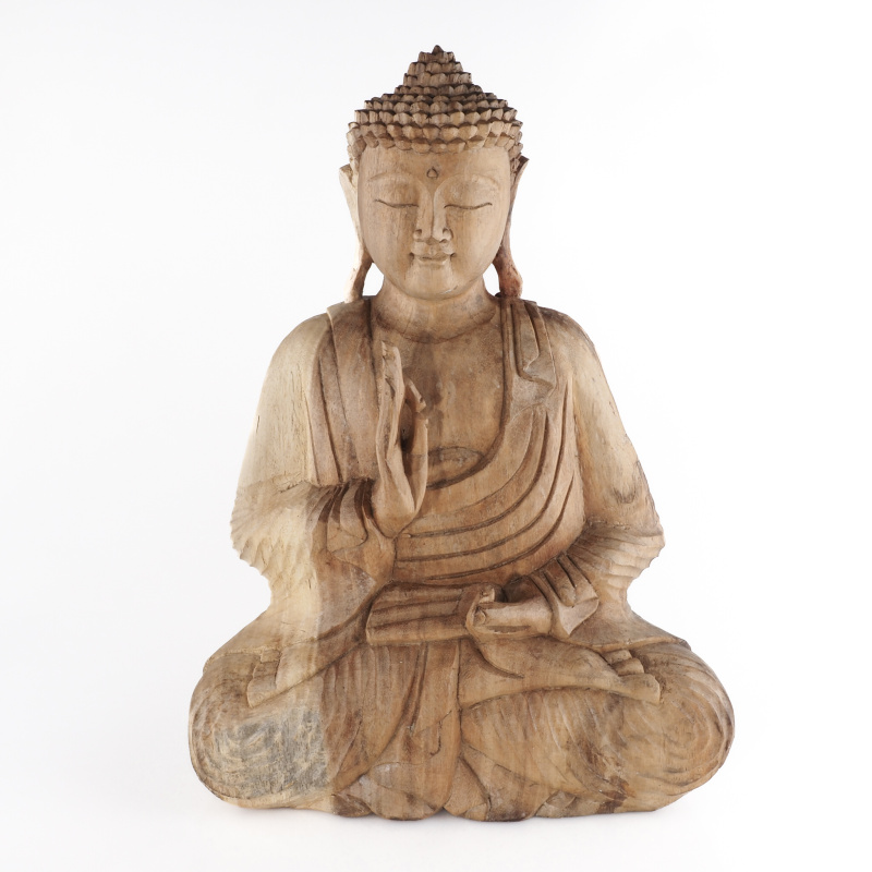 Dřevěné sochy Buddhy zaujímají v buddhistickém umění zvláštní místo. Vyřezané ze štědrosti přírody vyzařují teplo a klid. Forma soch, držení těla a gesta rukou, znamé jako mudry, mají specifické významy. Spojení palce a ukazováčku do kruhu, přičemž ostatní tři prsty zůstávají natažené, se nazývá Vitarka mudra. Je gestem intelektuálního diskursu, vzdělávání a předávání moudrosti. Kruh zde představuje nepřetržitý tok energie symbolizující nekonečný cyklus výuky a učení. Dlaň směřuje ven, což znamená otevřenost a akt komunikace. Symbolickou váhu má i samotný materiál - dřevo. V mnoha kulturách představuje růst, transformaci a spojení s přírodou. Přirozené nedokonalosti dodávají každé soše charakter a osobitost.
