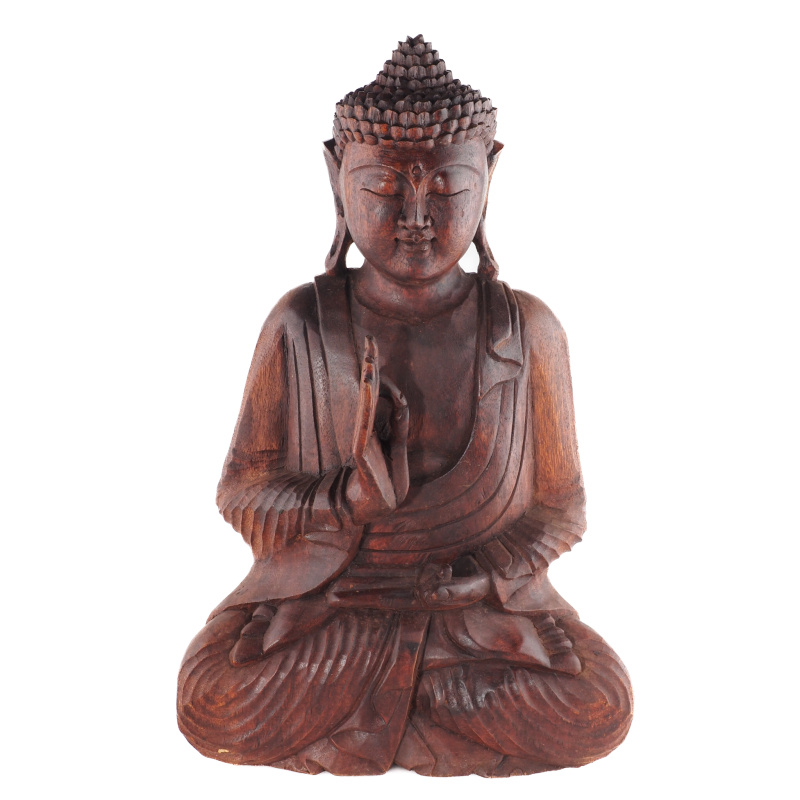 Dřevěné sochy Buddhy zaujímají v buddhistickém umění zvláštní místo. Vyřezané ze štědrosti přírody vyzařují teplo a klid. Forma soch, držení těla a gesta rukou, znamé jako mudry, mají specifické významy. Spojení palce a ukazováčku do kruhu, přičemž ostatní tři prsty zůstávají natažené, se nazývá Vitarka mudra. Je gestem intelektuálního diskursu, vzdělávání a předávání moudrosti. Kruh zde představuje nepřetržitý tok energie symbolizující nekonečný cyklus výuky a učení. Dlaň směřuje ven, což znamená otevřenost a akt komunikace. Symbolickou váhu má i samotný materiál - dřevo. V mnoha kulturách představuje růst, transformaci a spojení s přírodou. Přirozené nedokonalosti dodávají každé soše charakter a osobitost.