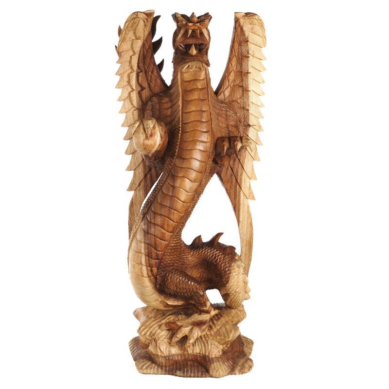 Drak je v mnoha tradičních kulturách považován za posvátné zvíře. Dle legendy drak ochraňoval ostrov Bali před vetřelci a nebezpečím. Motiv draka vyjadřuje sílu, odvahu, prosperitu a štěstí. Věří se, že drak je strážcem bohů a oddaně chrání posvátnost domova. Perla, kterou drak drží, je symbolem moudrosti a duchovní energie. Symbolickou váhu má i samotný materiál - dřevo. V mnoha kulturách představuje růst, transformaci a spojení s přírodou. Přirozené nedokonalosti dodávají každé soše charakter a osobitost.