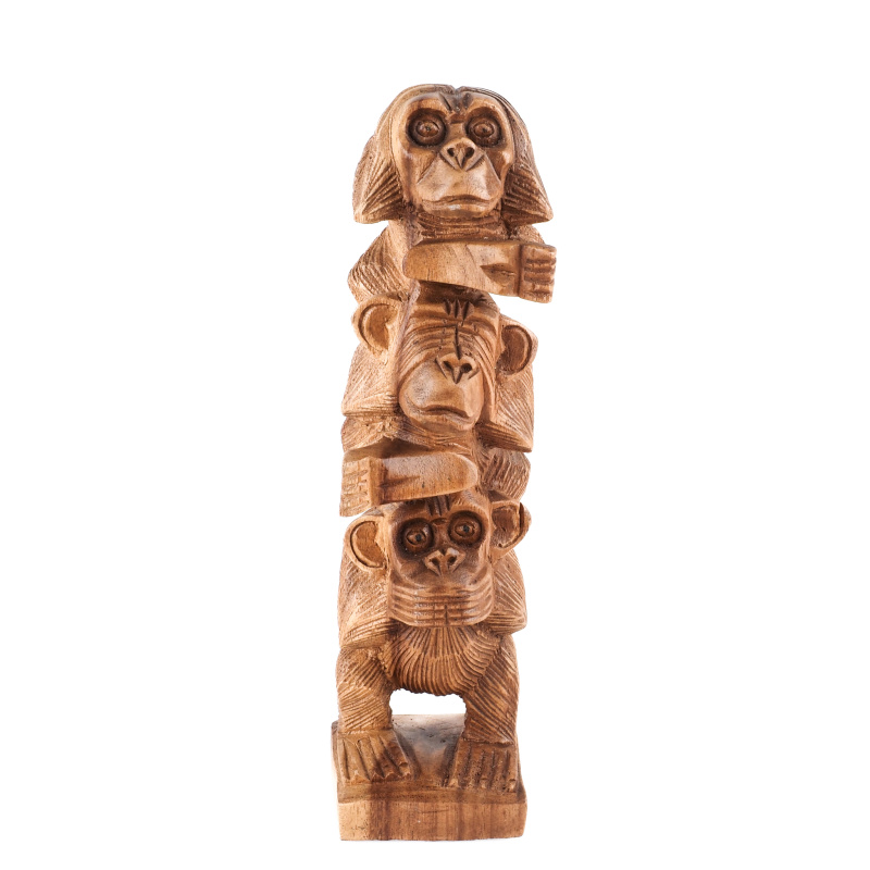 Tři moudré opice, tradičně interpretovány jako "nevidím zlo, neslyším zlo, nemluvím zlo", jsou v buddhismu vyjádřením etické zásady nekonání zla a neubližování, a zároveň odmítnutí nesprávného chování druhých. Vyzývají, abychom se nezabývali zlými myšlenkami a udrželi si tak vnitřní mír a pozitivitu. Učí nás osobní odpovědnosti a vědomému rozhodnutí nenechat se zasáhnout a ovlivnit negativitou. Jejich znázornění je symbolem moudrosti, duchovního klidu a zdrženlivosti od špatnosti. Symbolickou váhu má i samotný materiál - dřevo. V mnoha kulturách představuje růst, transformaci a spojení s přírodou. Přirozené nedokonalosti dodávají každé soše charakter a osobitost.