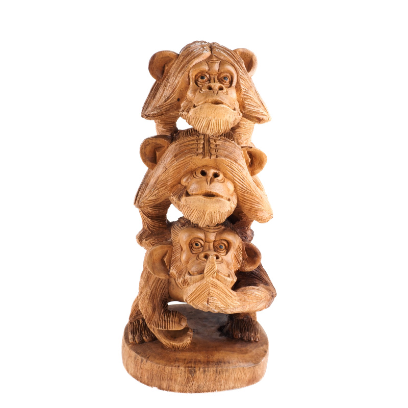 Tři moudré opice, tradičně interpretovány jako "nevidím zlo, neslyším zlo, nemluvím zlo", jsou v buddhismu vyjádřením etické zásady nekonání zla a neubližování, a zároveň odmítnutí nesprávného chování druhých. Vyzývají, abychom se nezabývali zlými myšlenkami a udrželi si tak vnitřní mír a pozitivitu. Učí nás osobní odpovědnosti a vědomému rozhodnutí nenechat se zasáhnout a ovlivnit negativitou. Jejich znázornění je symbolem moudrosti, duchovního klidu a zdrženlivosti od špatnosti. Symbolickou váhu má i samotný materiál - dřevo. V mnoha kulturách představuje růst, transformaci a spojení s přírodou. Přirozené nedokonalosti dodávají každé soše charakter a osobitost.