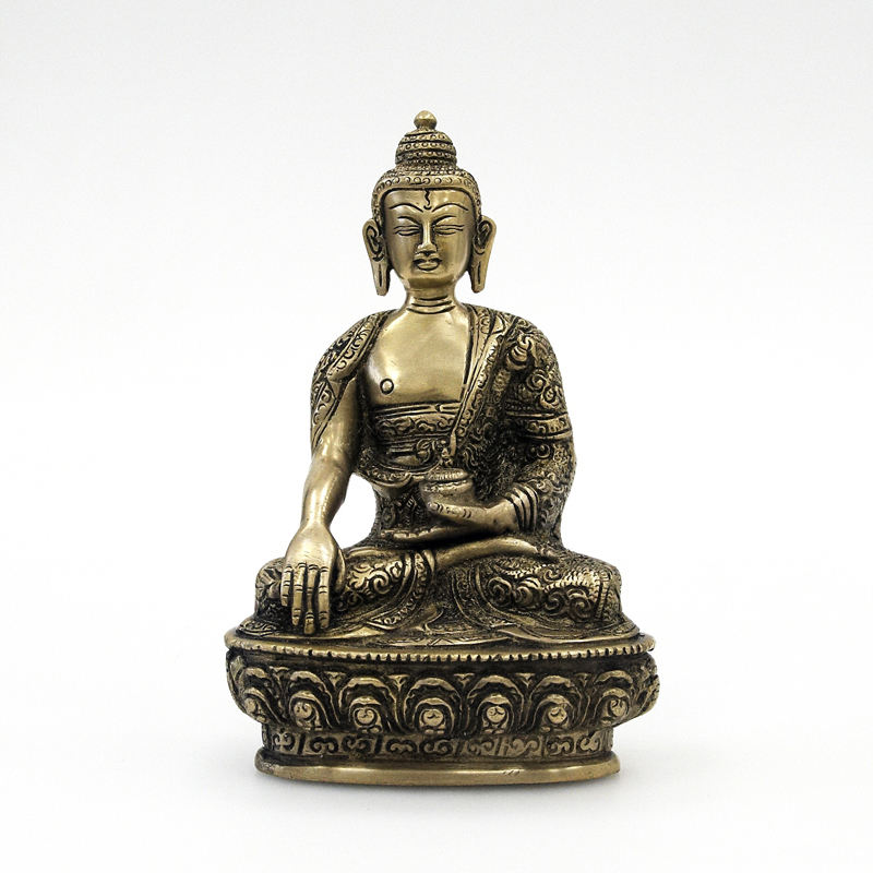 Buddha bývá zobrazován s oholenou hlavou, nebo nakrátko ostříhanými vlasy, někdy s korunou. Jeho barvou je zlatá.