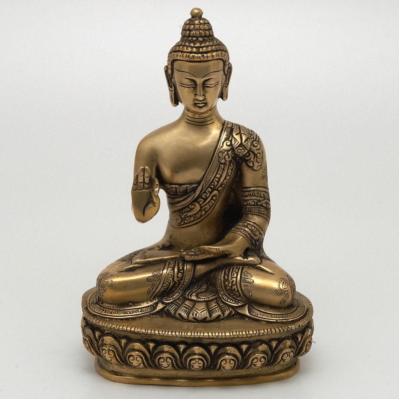 Buddha bývá zobrazován s oholenou hlavou, nebo nakrátko ostříhanými vlasy, někdy s korunou. Jeho barvou je zlatá.