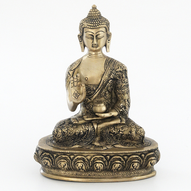 Buddha bývá zobrazován s oholenou hlavou, nebo nakrátko ostříhanými vlasy, někdy s korunou. Jeho barvou je zlatá.