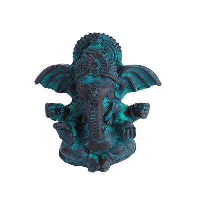 Soška znázorňuje sedícího Ganeshu. Je odlita z resinu a má patinu vytvořenou zelenou barvou. Resin je směs polyesterové pryskyřice a plavené křídy. Výrobky z resinu jsou velice precizně vypracované s důrazem na každý detail.