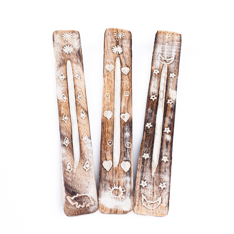 Stojánek na vonné tyčinky, lyže bílá, zdobená ručně vyřezávanými motivy.