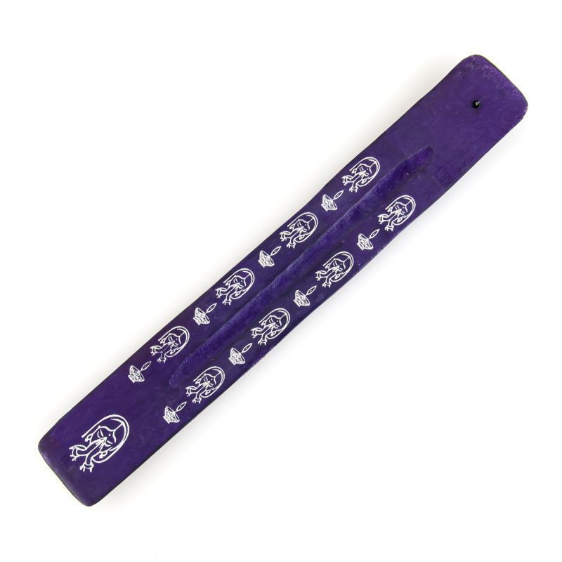 Stojánek na vonné tyčinky - lyže Hindu tmavě fialová, zdobená potištěnými motivy.