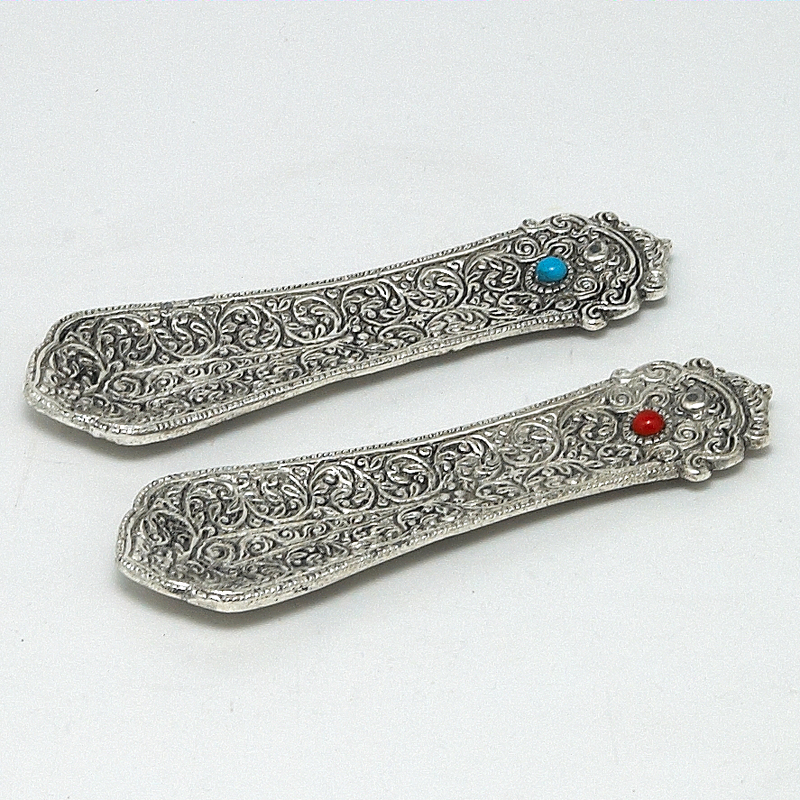 Indický kovový stojánek k pálení jehlánků a indických vonných tyčinek je zdoben ornamenty a barevnou čočkou. Na spodní straně stojánku jsou tři kovové nožky, stojánek je stabilní.