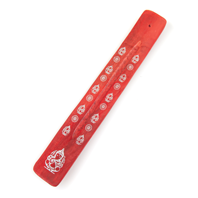 Stojánek na vonné tyčinky - lyže Manju Ganesha červená, zdobená potištěnými motivy.