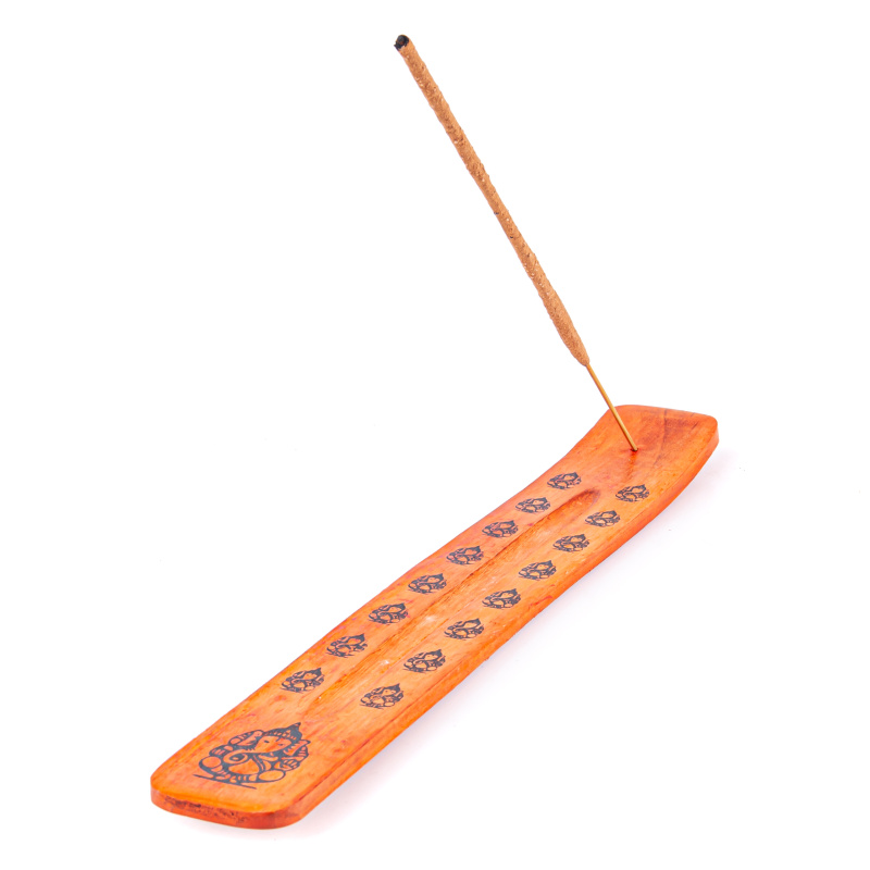 Stojánek na vonné tyčinky - lyže Manju Ganesha oranžová, zdobená potištěnými motivy.