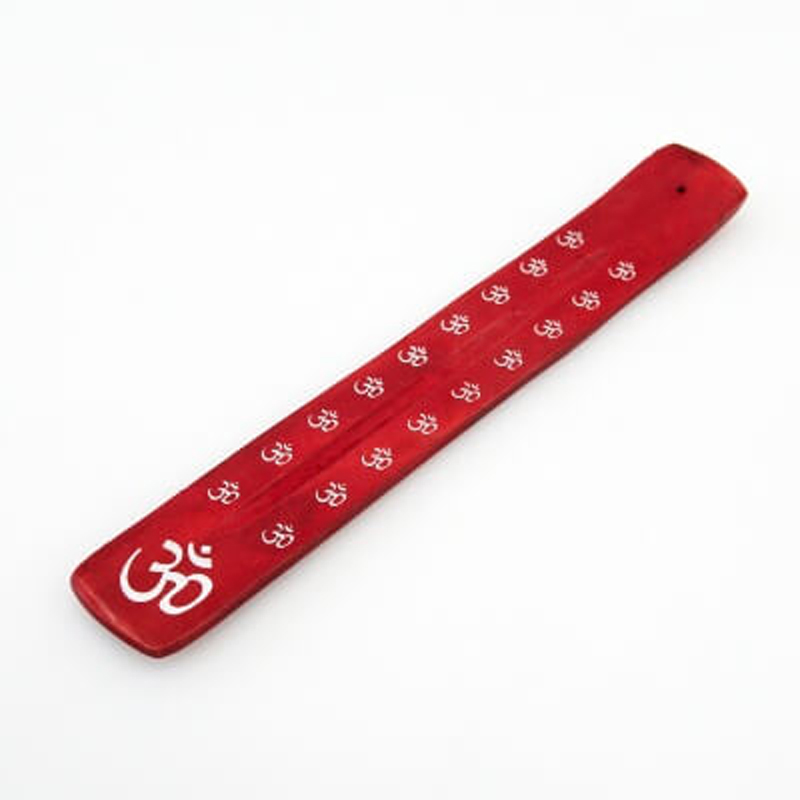 Stojánek na vonné tyčinky - lyže Manju Om červená, zdobená potištěnými motivy.
